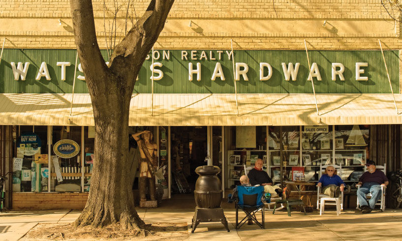 Downtown, a stalwart is the hardware store, its rockers always welcoming. Chip Watson, second from left, has worked there 47 years. With him: Lawrence Stevens, Lawrence Nottingham and Crash Robins, all locals.